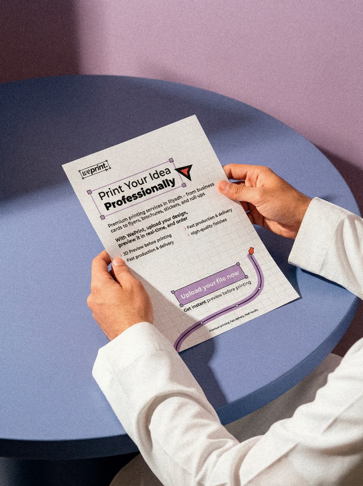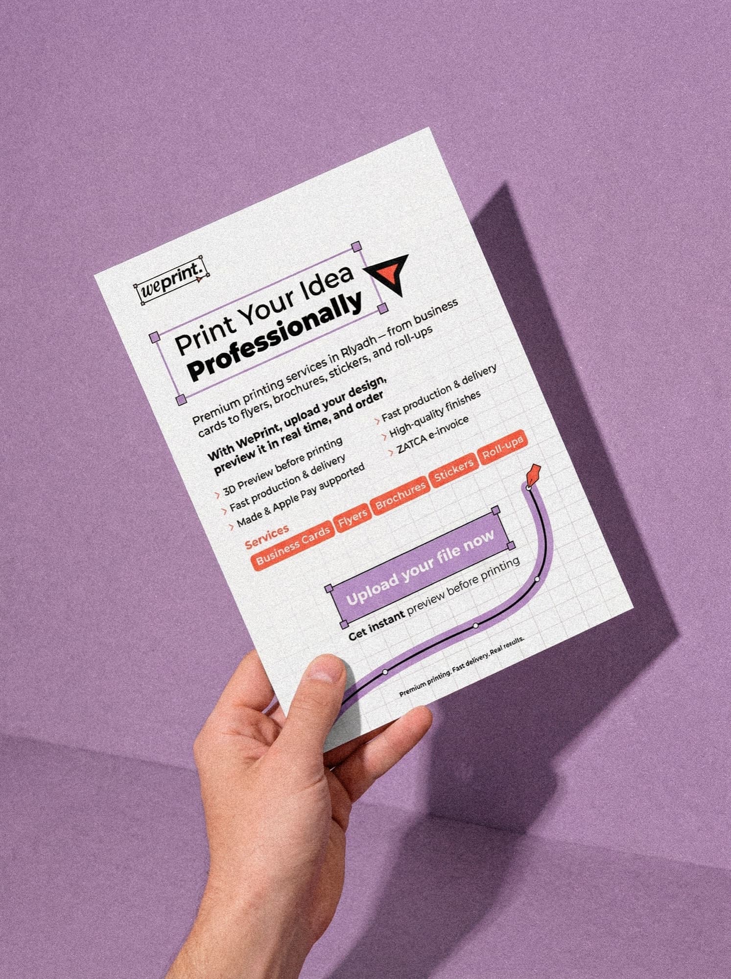 ارفع تصميمك، حدّد مواصفاتك، ودع شبكة مطابع الرياض تتولى الباقي. توصيل في نفس اليوم أو اليوم التالي.