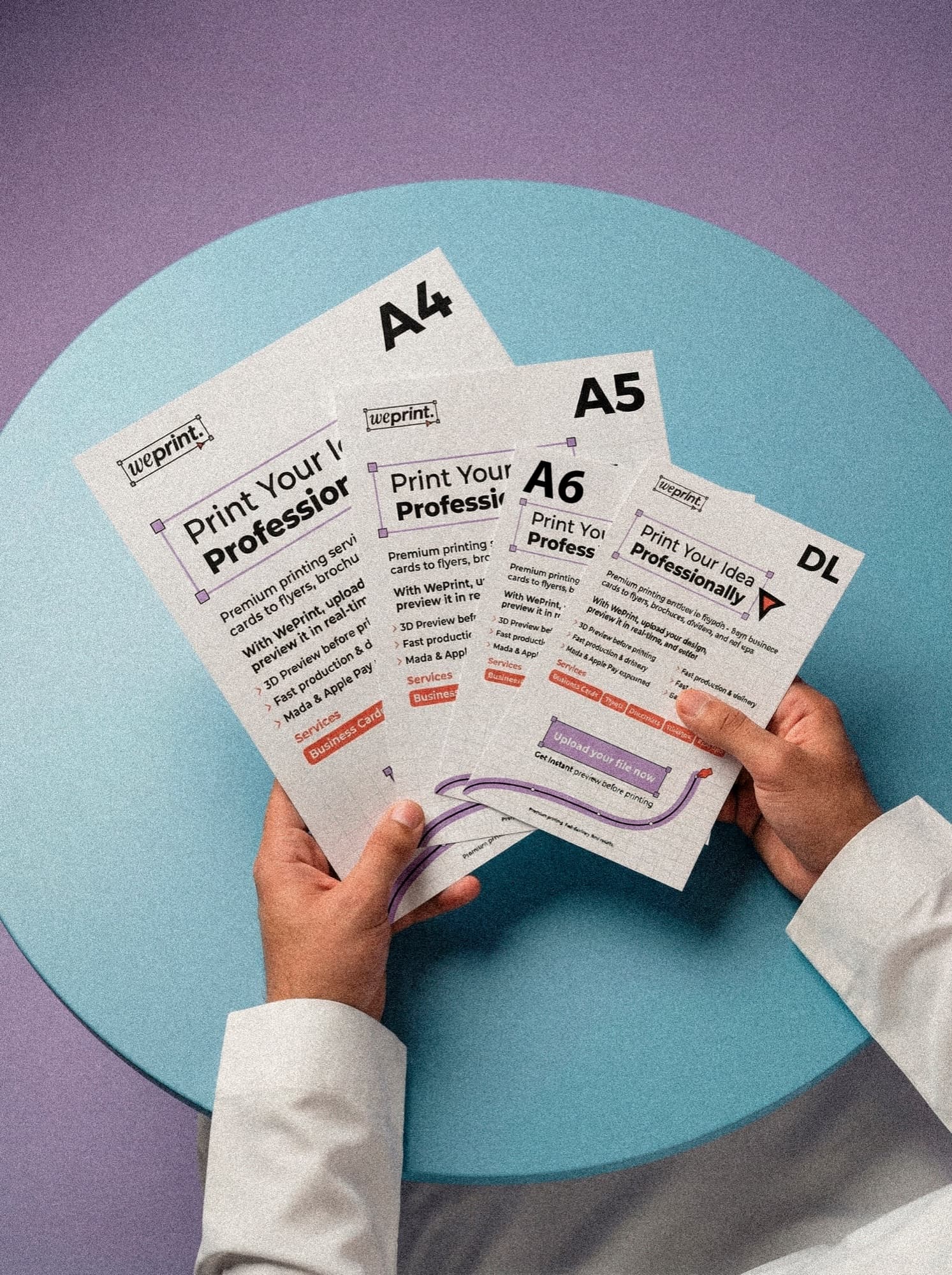 A3 (297×420mm) · A2 (420×594mm) · A1 (594×841mm)135gsm Satin / 150gsm Gloss / 170gsm Matteتغليف لامع / تغليف مطفي / لمسة ناعمة