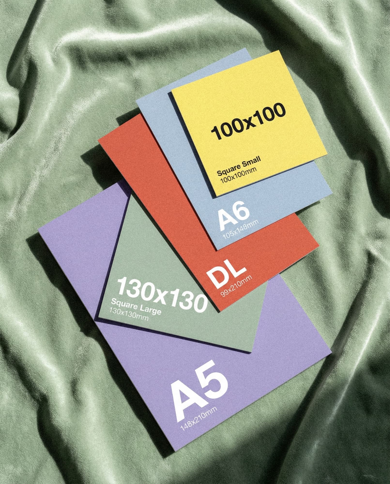 A6 (105×148mm) · Square (100×100mm) · DL (99×210mm)350gsm Gloss / 400gsm Silk / 300gsm Uncoatedتغليف مطفي / تغليف لامع / لمسة ناعمة